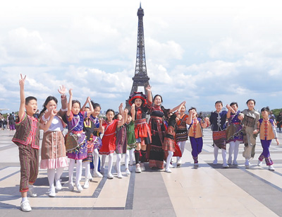五指山黎苗童聲合唱團在巴黎埃菲爾鐵塔前留影。五指山市委宣傳部供圖