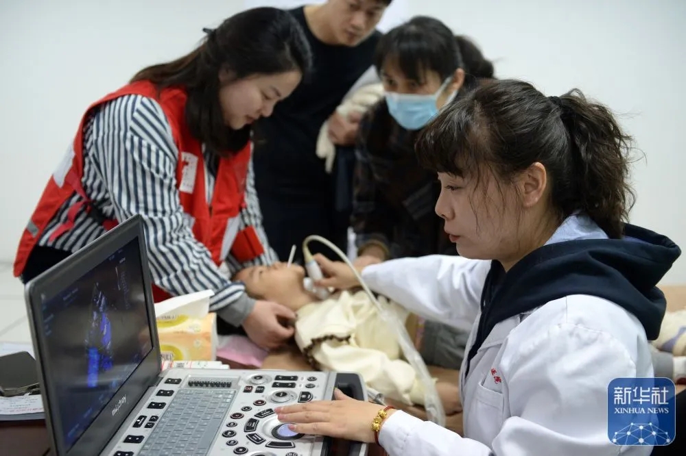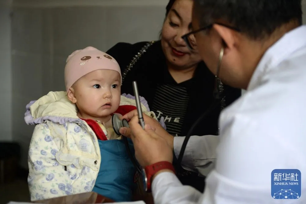 3月25日,在阿勒泰市婦幼保健院,濟南市中心醫(yī)院的醫(yī)療專家在給孩子做檢查。新華社記者 劉勇貞 攝影報道