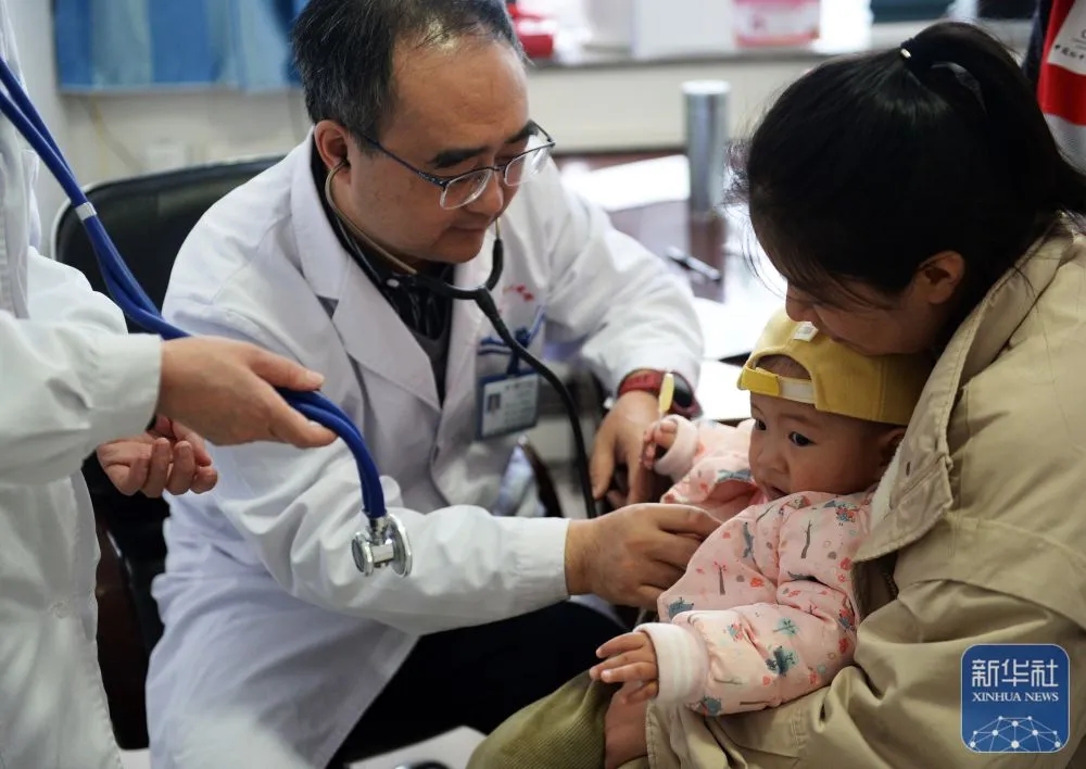3月25日,在阿勒泰市婦幼保健院,濟南市中心醫(yī)院的醫(yī)療專家在給孩子做檢查。