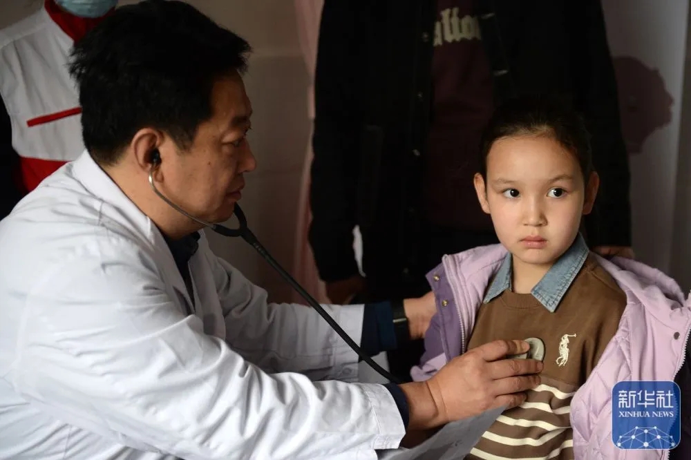 3月28日,在塔城地區(qū)人民醫(yī)院,濟南市中心醫(yī)院的醫(yī)療專家在給孩子做檢查。