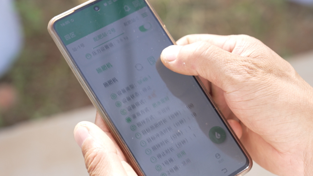 工作人員用手機演示操作水肥一體化自動化系統(tǒng)。(受訪對象供圖)
