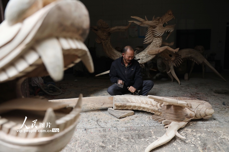 一個龍船頭中間鏤空,重約30斤,一般需要一個工匠花費(fèi)12天左右的時間雕琢而成。道縣龍船頭雕刻精美、栩栩如生、獨(dú)具特色。2024年2月,陳兵壽入選第五批省級非物質(zhì)文化遺產(chǎn)端午節(jié)(道州龍船習(xí)俗)代表性傳承人。