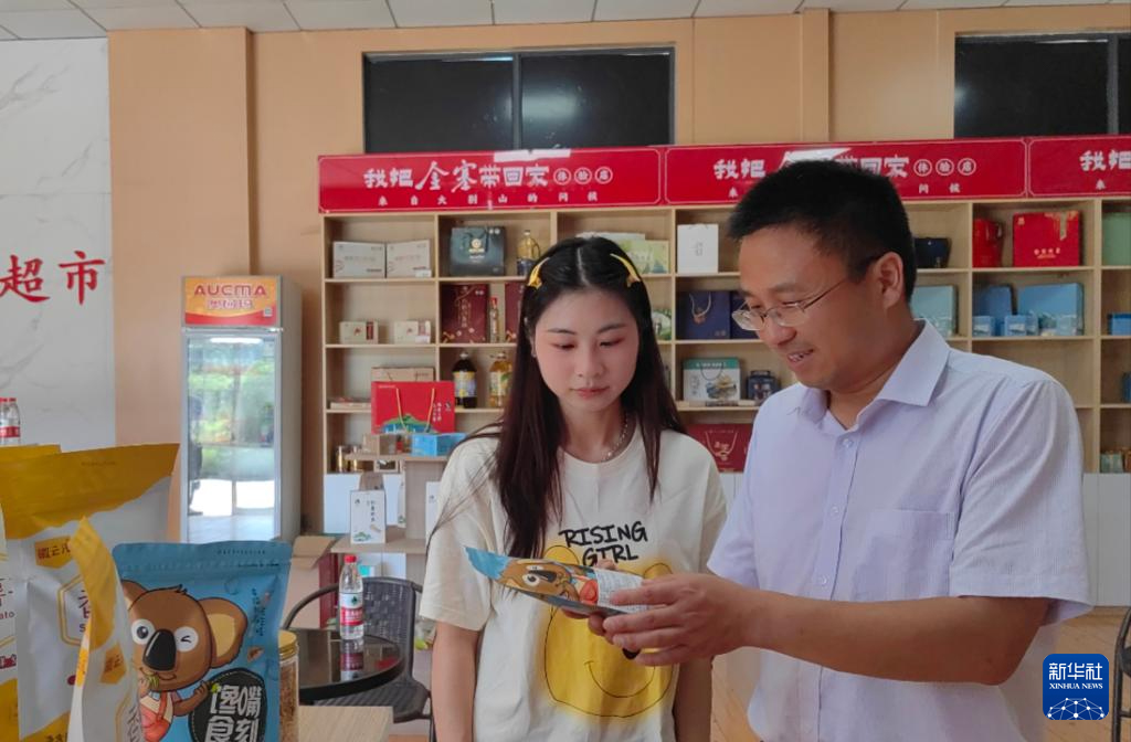 6月14日,在金剛臺(tái)愛(ài)心超市,25歲的返鄉(xiāng)青年吳靜(左)和國(guó)網(wǎng)安徽電力駐金寨縣湯家匯鎮(zhèn)金剛臺(tái)村第一書(shū)記馬靜(右)忙著給貨架“上新”。新華社記者 馬欣然 攝