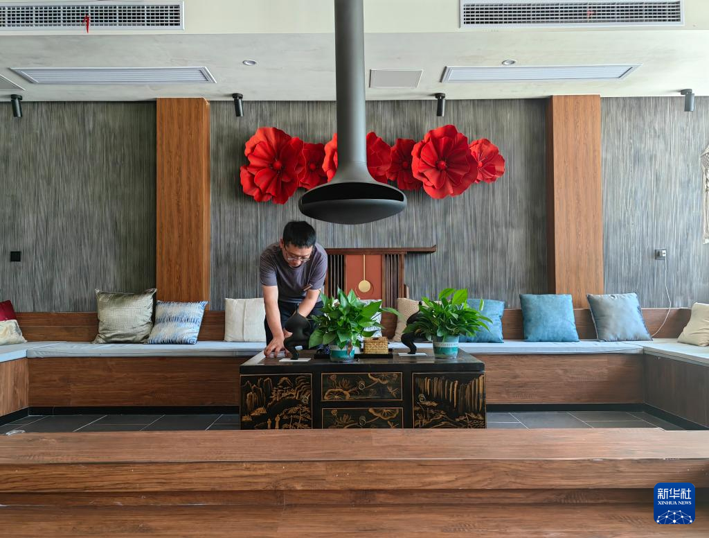 6月14日,金紅賓館經(jīng)理李立三在前廳進(jìn)行桌面布置。新華社記者 馬欣然 攝