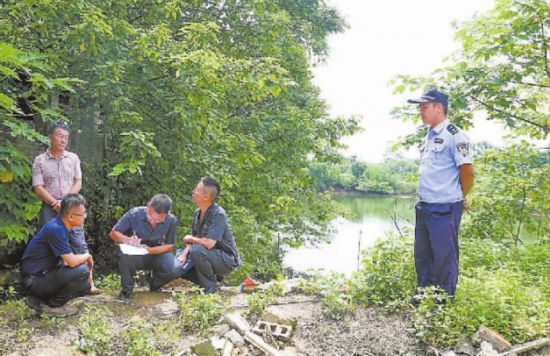 圖③:清塘后,執(zhí)行干警與某農(nóng)場負(fù)責(zé)人確認(rèn)魚塘交付情況。