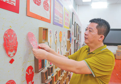 周繼川將學生的瓊劇剪紙作品張貼在展覽室。人民日報記者 曹文軒 攝