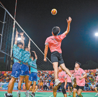 場(chǎng)邊摩肩接踵,晚到的觀眾席地而坐。開賽后,隊(duì)員們扣球、攔網(wǎng),比分膠著。場(chǎng)邊,拉拉隊(duì)敲鑼打鼓,掌聲、歡呼聲隨著賽況不斷起伏。