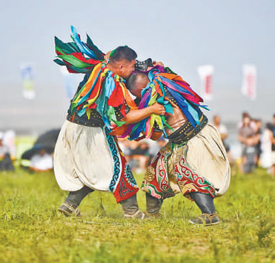在第三十四屆草原那達(dá)慕(圖②,人民日?qǐng)?bào)記者 吳勇攝)上勇奪搏克比賽冠軍后,查干扎那又奔赴內(nèi)蒙古自治區(qū)鄂爾多斯市伊金霍洛旗札薩克鎮(zhèn),參加了一場(chǎng)“村級(jí)那達(dá)慕”搏克比賽。“參賽選手水平都很高,我們比得很盡興!辈楦稍钦f(shuō),每年暑期,他都要參加10多場(chǎng)那達(dá)慕搏克比賽,“每場(chǎng)都有很多熱情的觀眾,我很享受那達(dá)慕的氛圍!