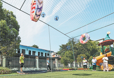 航模隊(duì)隊(duì)員在操場(chǎng)上進(jìn)行無人機(jī)足球?qū)官。李桂東 攝(人民視覺)