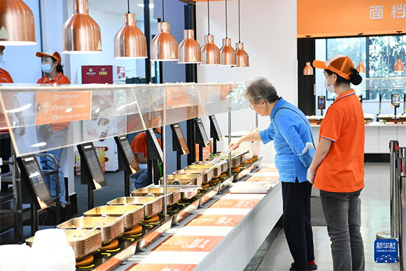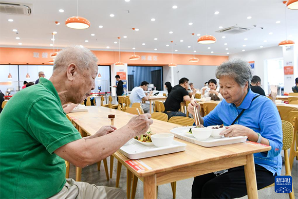 11月1日,陳鳳基(右)和石云山在深圳市福田區(qū)益田社區(qū)數(shù)字食堂就餐。新華社記者 梁旭 攝
