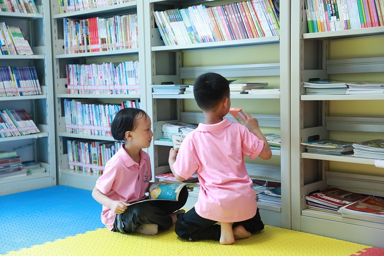 孩子們在“陽光驛站”的閱讀角選書、看書