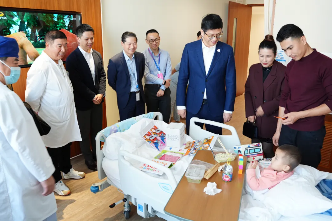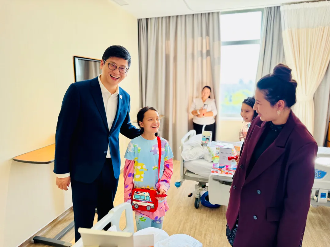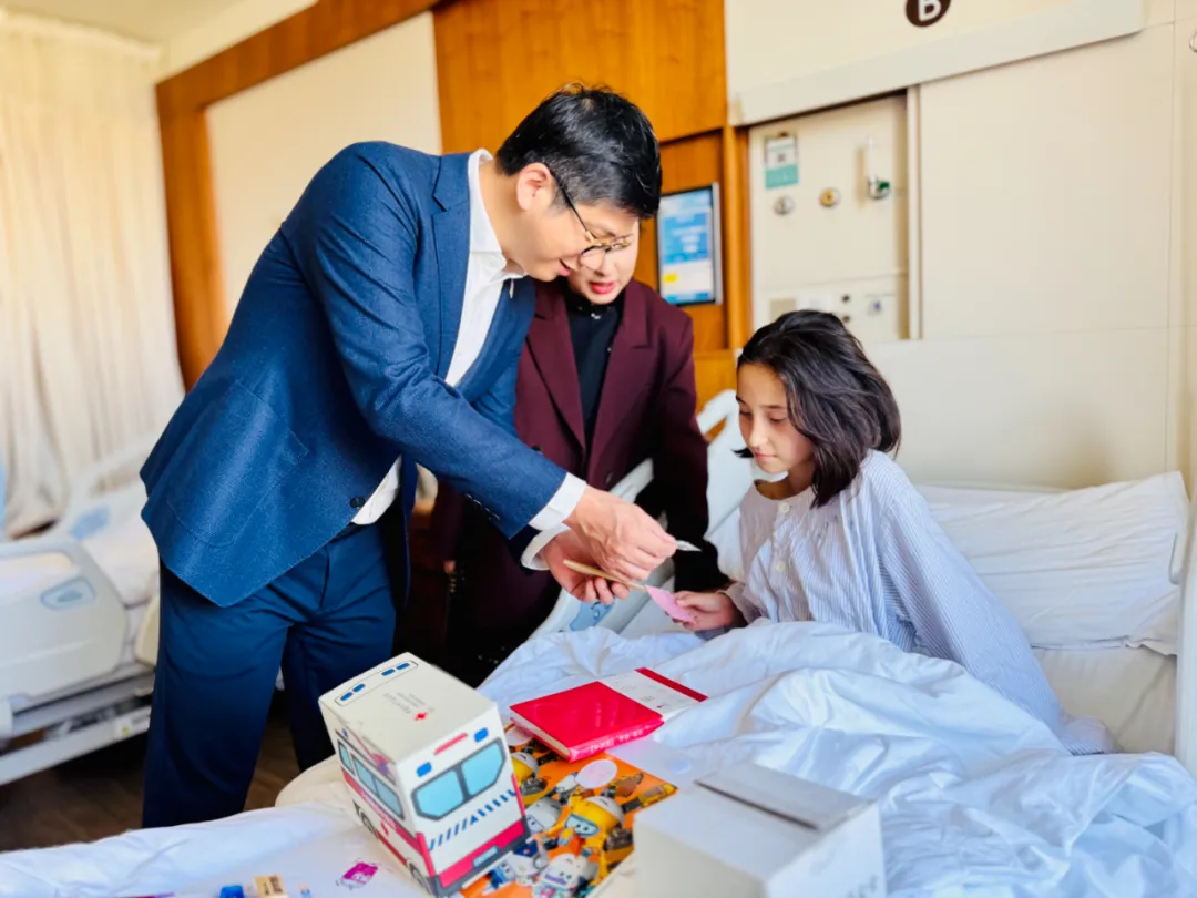 11月8日,中國紅十字基金會理事長貝曉超一行來到上海德達醫(yī)院,探望19名在院接受治療的新疆先心病患兒,并為孩子們送上英雄能量包,祝愿他們早日康復。