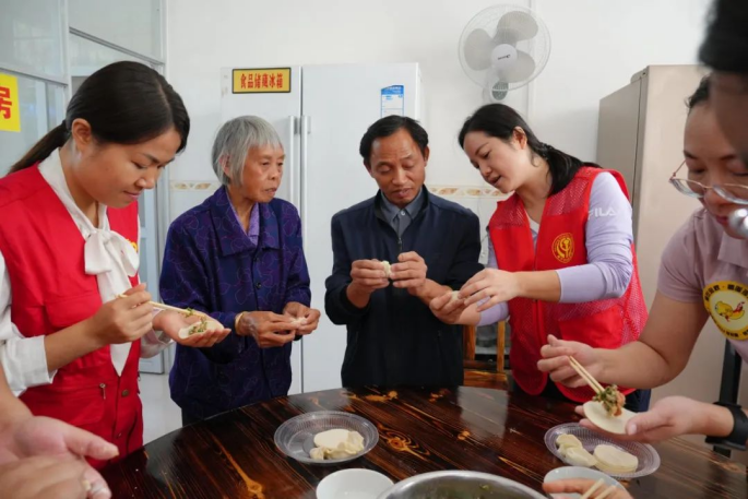 在飯?zhí)?,志愿者和老人們圍坐在一起包餃子,鮮美的餃子下鍋煮熟后,志愿者攙扶行動不便的老人坐好,把熱氣騰騰的餃子端給他們?!昂贸裕 薄霸偬硪煌?!”歡聲笑語回蕩在院內(nèi)每個角落。