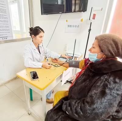 古力亞爾·阿不都外力(左)在為村民測(cè)量血壓。熱孜萬古麗·約賽尹 攝