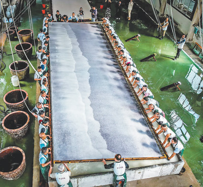 “一、二、三,起!”隨著整齊的號子聲,44名撈紙工人用手一齊將長11.4米、寬3.6米的簾床從紙槽中撈出,在8名工人的輔助下,隨著漿水緩緩滴下,一張“三丈三”巨型宣紙雛形初現(xiàn)。