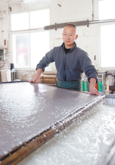 作為廠里的技術(shù)骨干,每當有特制的宣紙,齊志國往往是指定的撈紙工。在“三丈三”制作中,齊志國便擔任了撈紙工隊長。