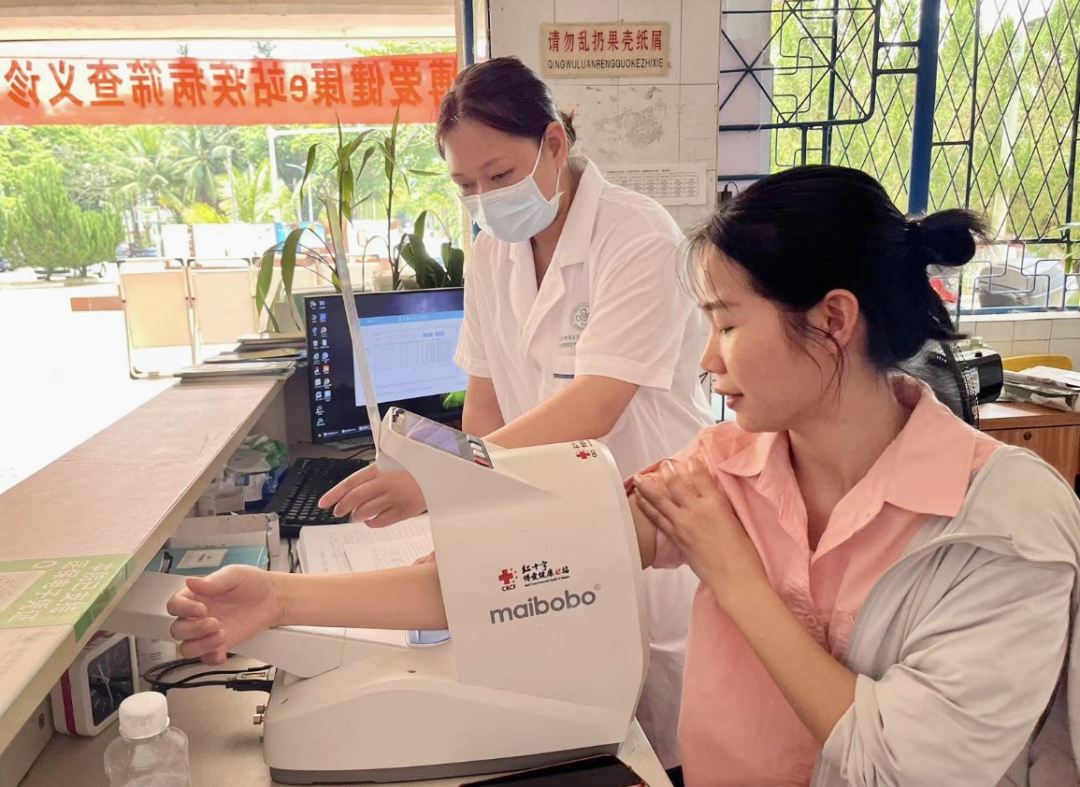 2024年4月,中國紅十字基金會在海南省白沙黎族自治縣援建的“紅十字博愛健康e站”中,醫(yī)務人員為群眾篩查義診。