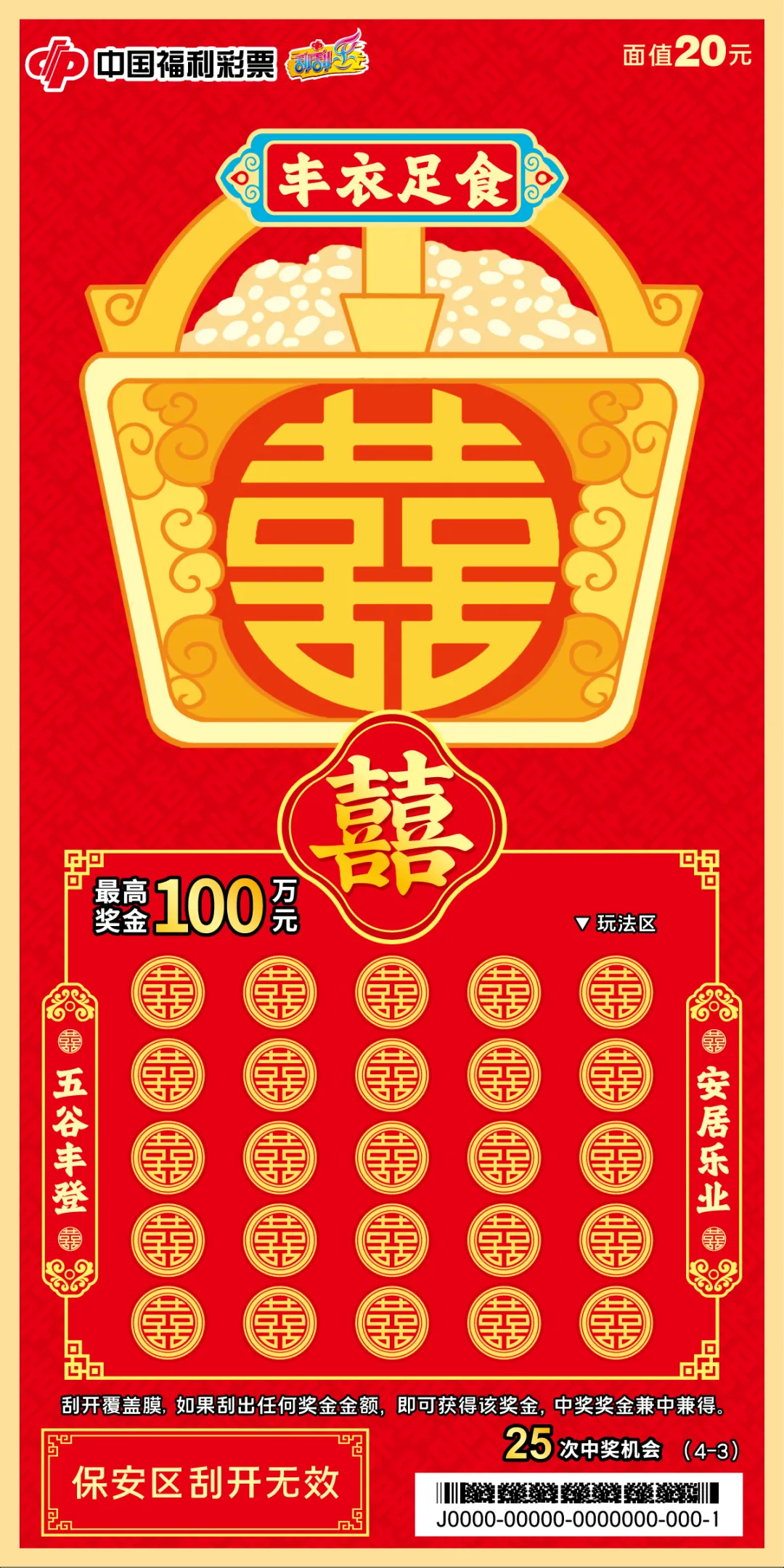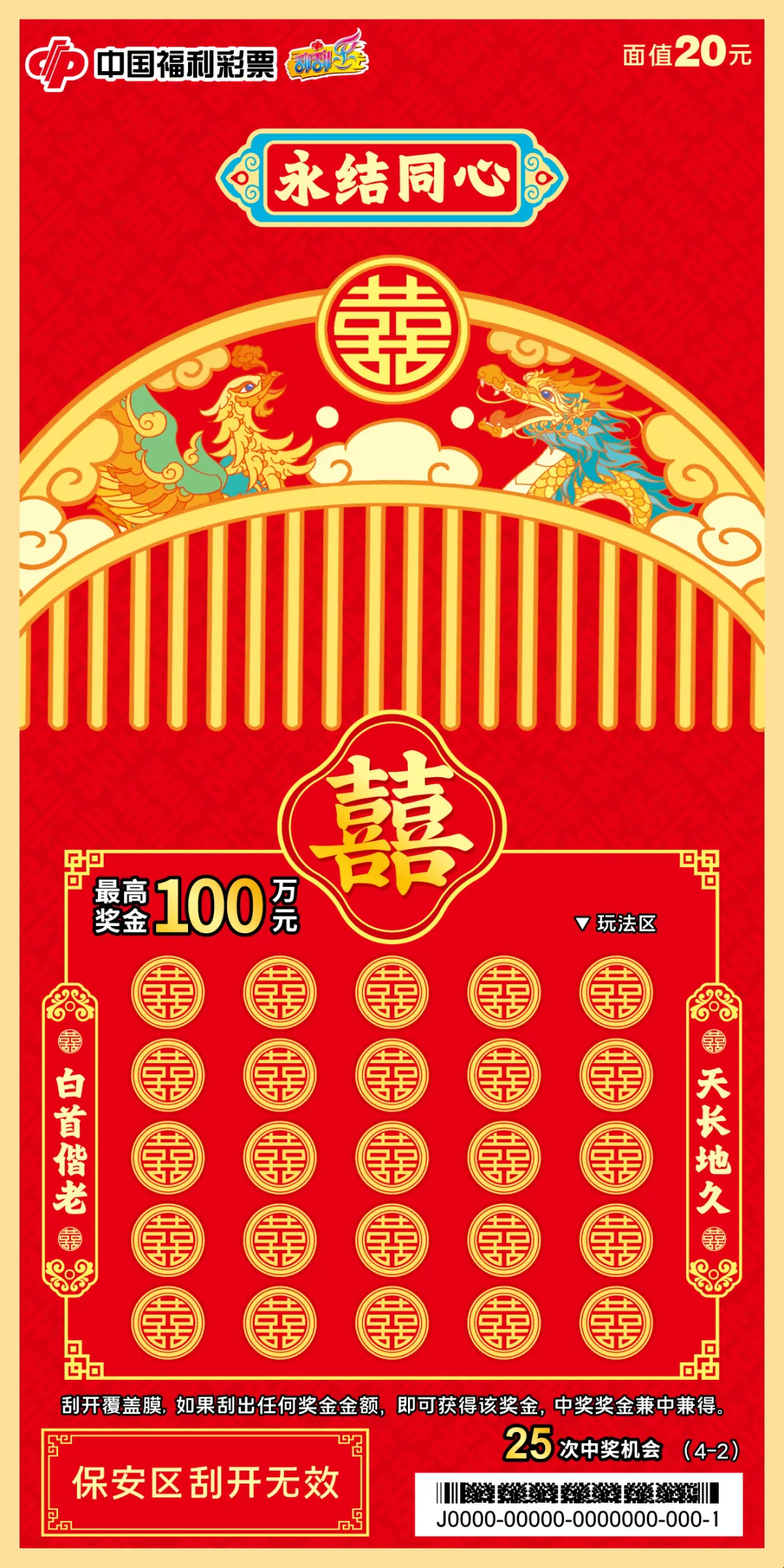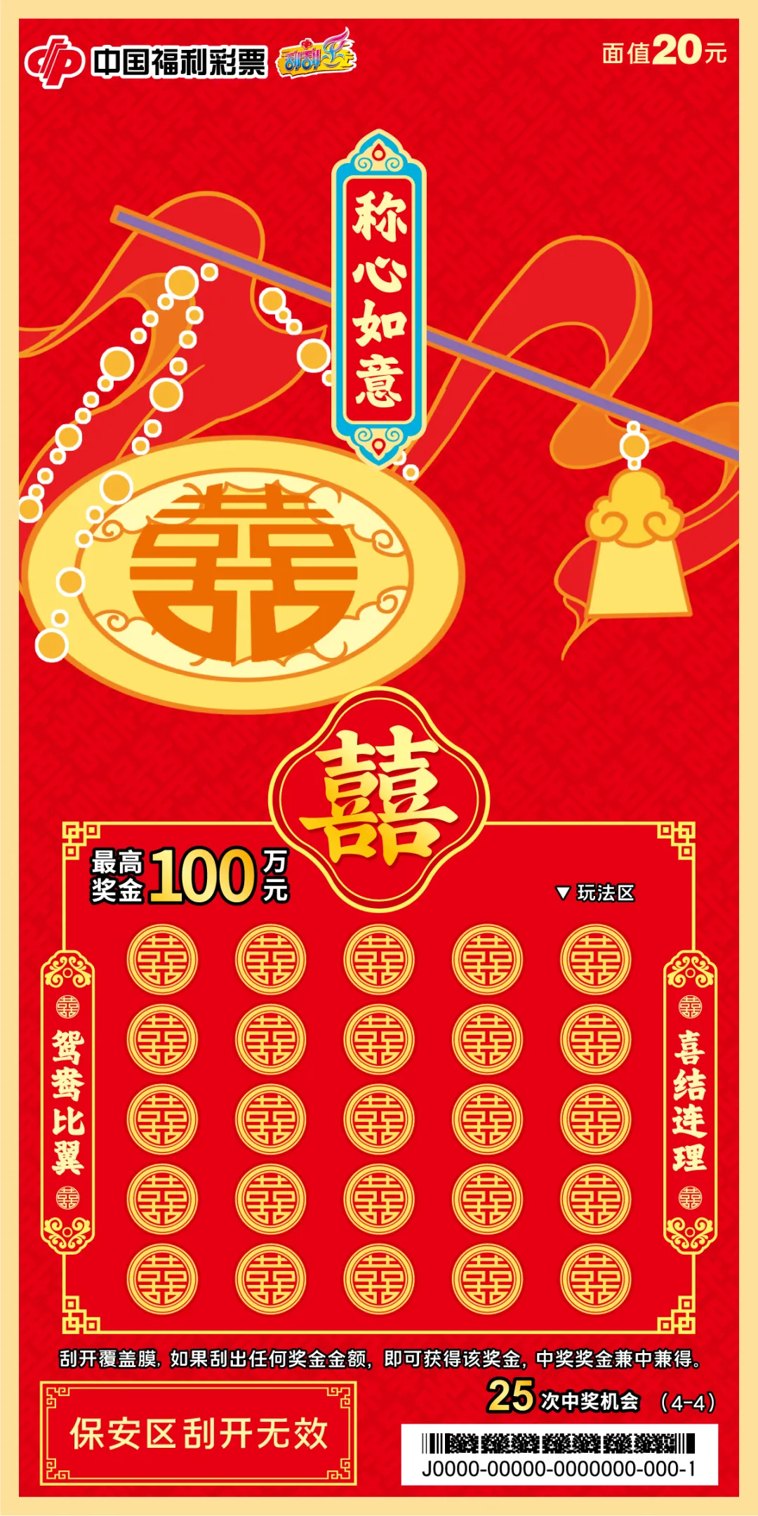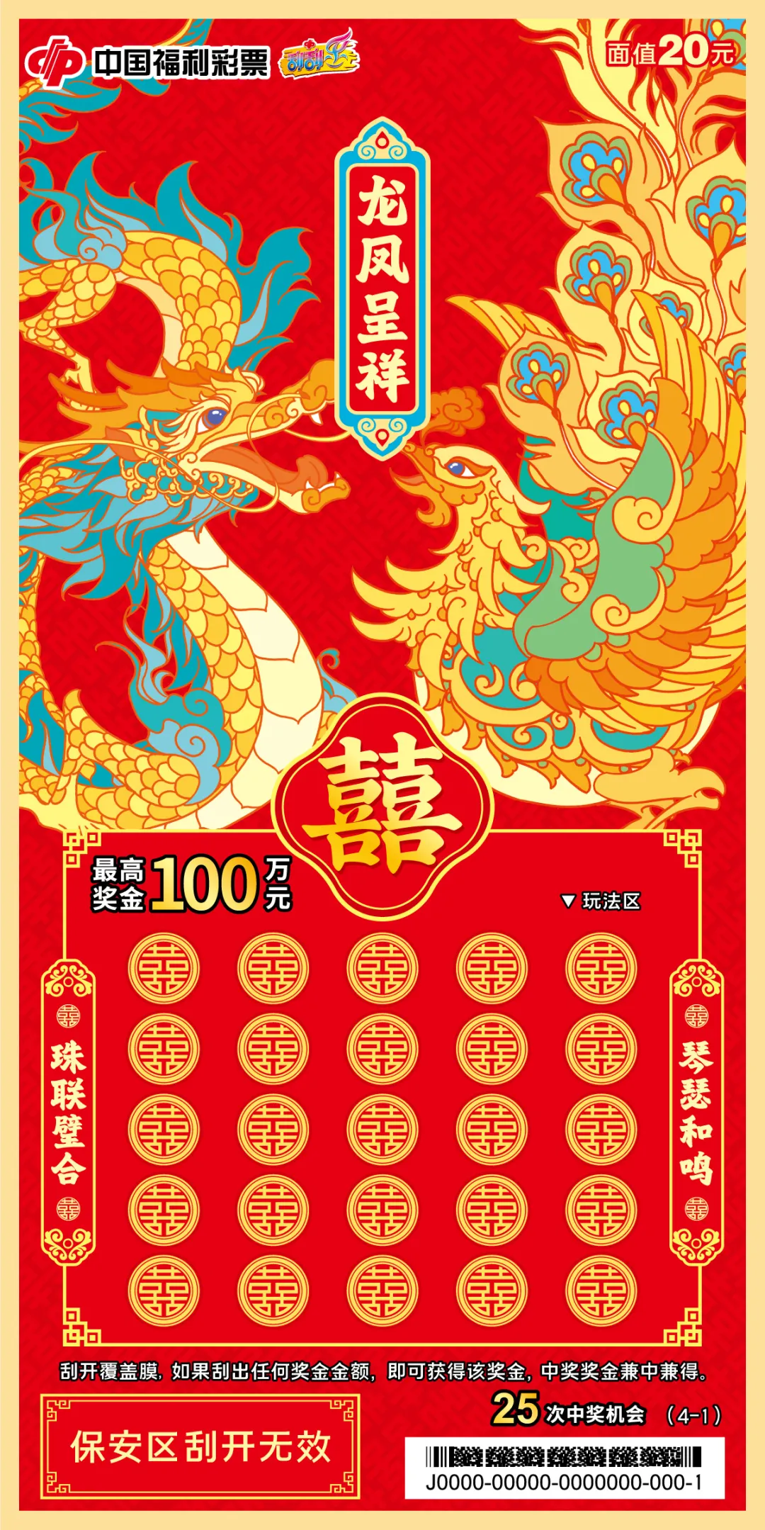 “囍”,形為“雙喜”,意為成雙成對(duì)的美意,喜上加喜的吉利,常用于婚慶等場(chǎng)合。雙喜臨門,喜事成雙,承載著美好寓意的喜文化,是我國傳統(tǒng)民俗文化的重要組成部分,寄托著對(duì)幸福生活的向往和追求。2024年的刮刮樂“囍”,將中國傳統(tǒng)婚俗文化與帶有中國傳統(tǒng)特色的吉祥圖案相結(jié)合,通過“龍鳳呈祥”“永結(jié)同心”“豐衣足食”“稱心如意”四個(gè)場(chǎng)景,將美好祝福送到購彩者手中。