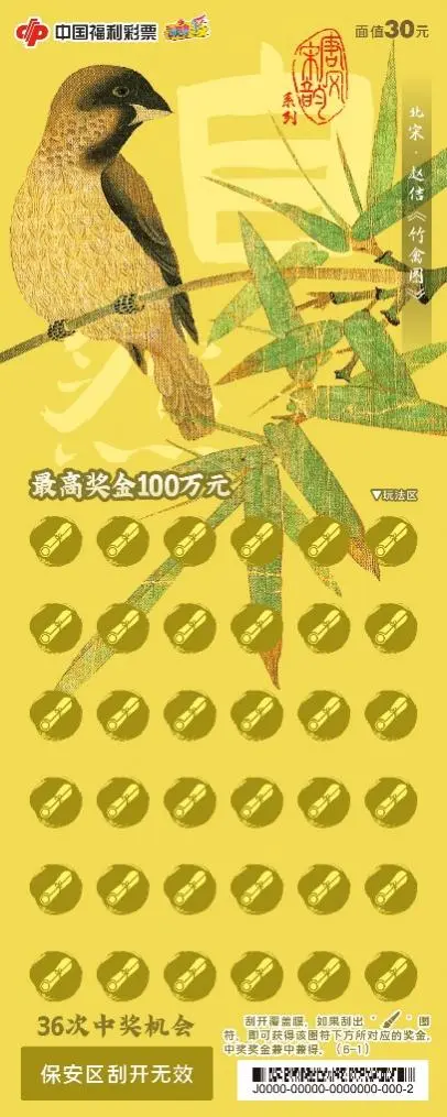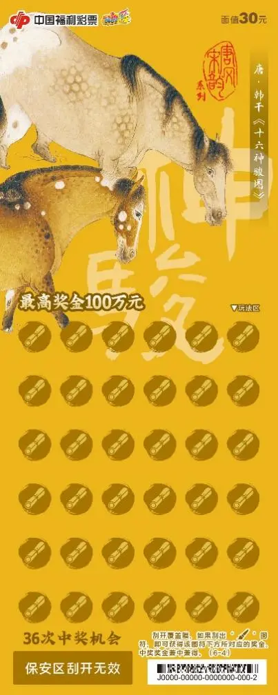 刮刮樂“唐風(fēng)宋韻”,將唐代畫家韓干的《十六神駿圖》、宋徽宗趙佶的《竹禽圖》、北宋畫家趙昌的《寫生鵪鶉圖》等唐宋時(shí)期的珍貴畫作搬上票面,用傳統(tǒng)的藝術(shù)元素結(jié)合現(xiàn)代的設(shè)計(jì)手法,使票面既具有古典韻味又不失時(shí)尚感,更充滿了濃厚的歷史文化氣息。